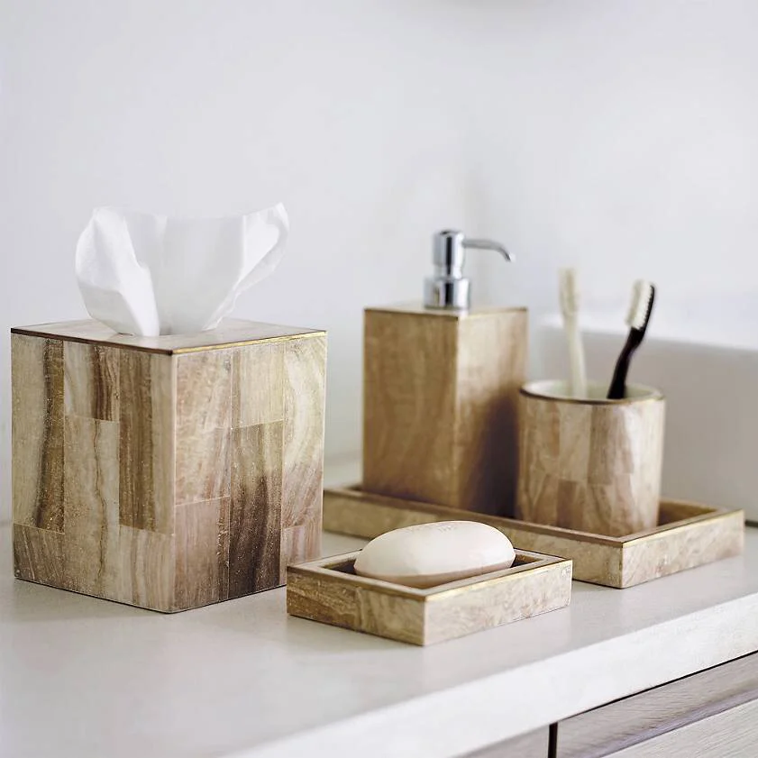 Picture yourself in a spa with vanity decor made from marble, tissue holders with shell inlay and soap dispensers of fine wood. Attain your sleek retreat by indulging with our sets of stylish bath decor.
